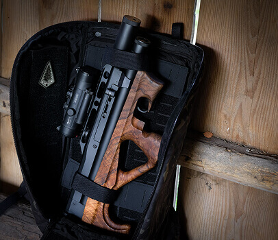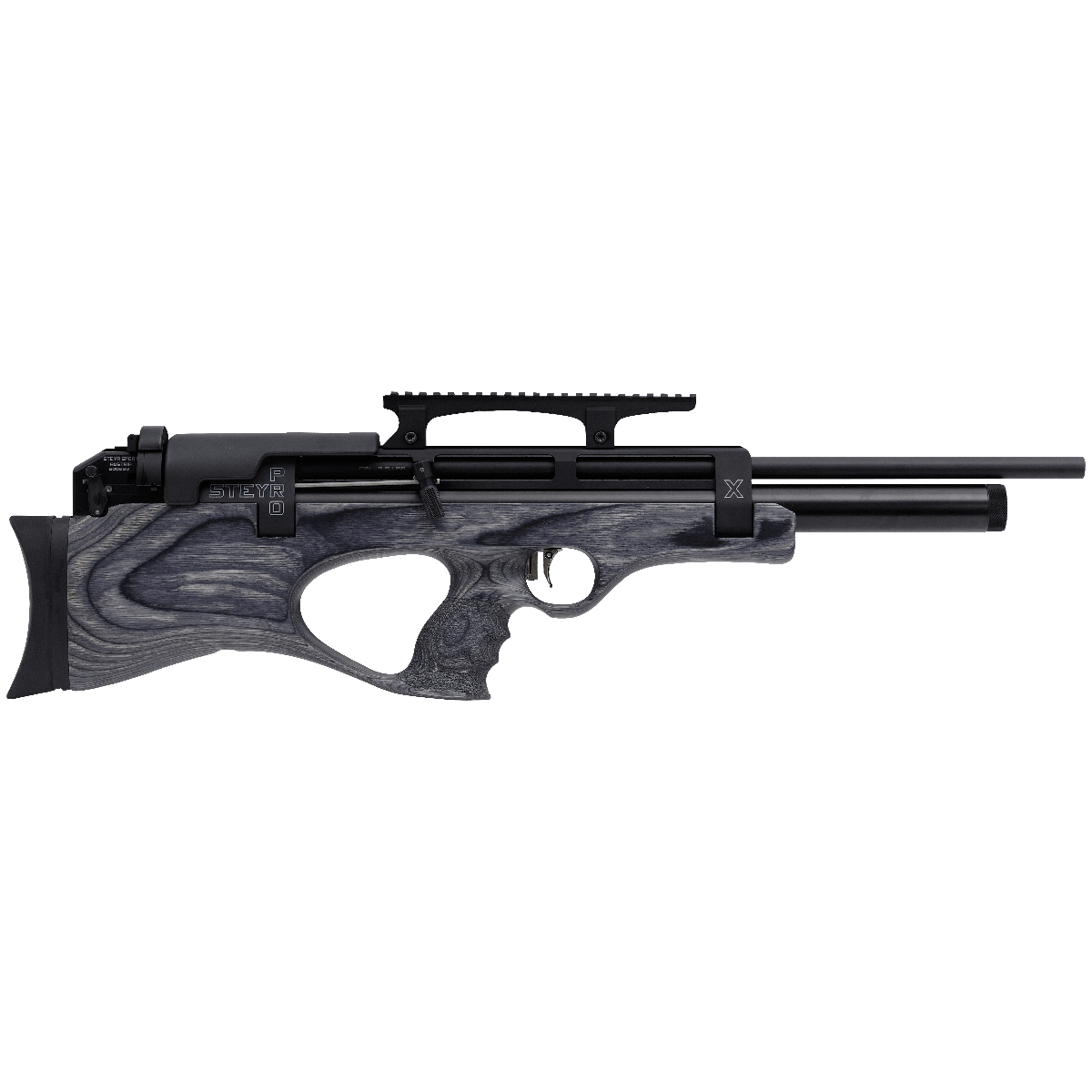 The Steyr Pro X is a regulated multi-shot and semi-automatic PCP Bullpup air rifle with a beautiful walnut ambidextrous stock. The 200 bar cylinder, the two-stage match trigger, the 520 mm match barrel, the 10-shot magazine, the Biathlon side lever system, and the extra-long cylinder (more capacity) make this a very accurate PCP air rifle but its also a pleasure to shoot with. The automatic repeating action allows ten quick shots directly out of the magazine.