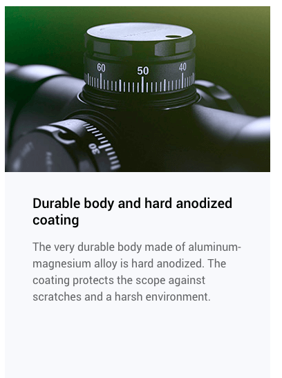 • wide range of adjustments and a big field of view makes DHF 1-7×24 day riflescope the universal and irreplaceable assistant on different types of hunting, as foiling hunting and stalk hunting. At 1x magnification and 20 ° field of view the device is used as a full-fledged collimator sight, allowing to observe and aim instantly and surely at near distances by two eyes, and 7x magnification allows to recognize and hit surely the target at long distances;