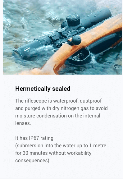 • the special optical system of the riflescope provides the image quality and angular permission on a midfield equal to models of well known deserved brands.